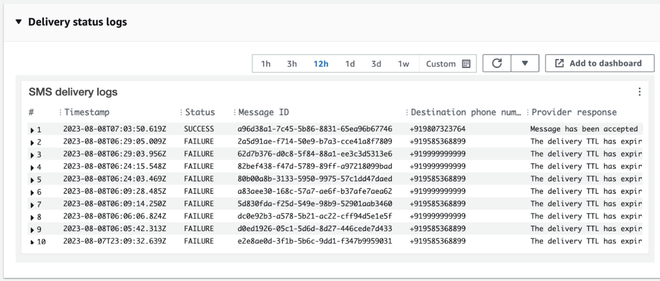 - Once configured, you’ll be able to see delivery logs of your sent messages on this console. You can also access it from cloudwatch console.