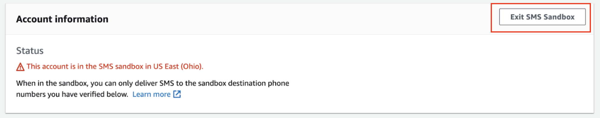 Before moving into configuration steps, here are a few other things to keep in mind:- SNS Sandbox Mode:If you are creating a new SNS account. Your account will be in SNS sandbox. AWS adds all new accounts in the SNS sandbox by default. In sandbox mode, you’ll be able to send messages to only verified destination phone numbers. Once you’re done testing, you can move out of the SNS sandbox. Refer next section for the steps to configure SNS sandbox and how to move your account out of it.