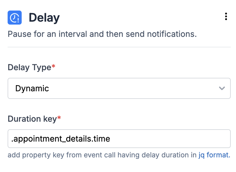 For instance, you might want to send a reminder one day before an interview date. In such scenarios, the reminder schedule can also be user-defined, resulting in variable delays per user. Consider the example of Google Calendar, where each user sets their own reminder schedule for meetings—some opt for reminders 10 minutes before, while others prefer 30 minutes before. Dynamic delays accommodate these individual preferences seamlessly.You can add duration key as a JQ-expression. Below are some examples of how to add duration key in JQ format: