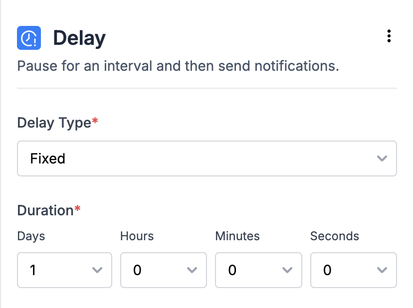 In case of dynamic delay, delay duration is computed using the data from trigger payload. Dynamic delays are helpful for reminders where the schedule is dictated by the user or when reminders need to be sent before the event or task due date.