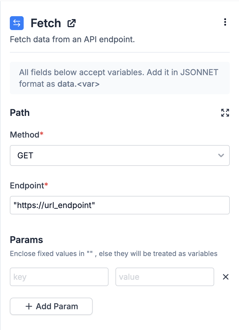 In a Fetch node, you have to define the endpoint, query params and headers. You can add both static and dynamic values in all request fields except response key. All Static values are added within"static value"