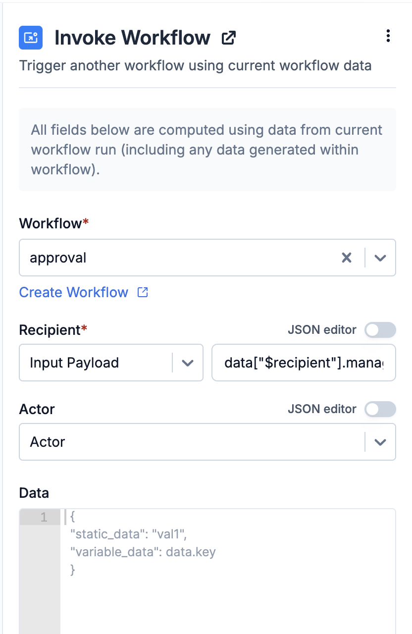 Recipient refers to the recipient of the target workflow. It can be:- The current workflow’s recipient or actor