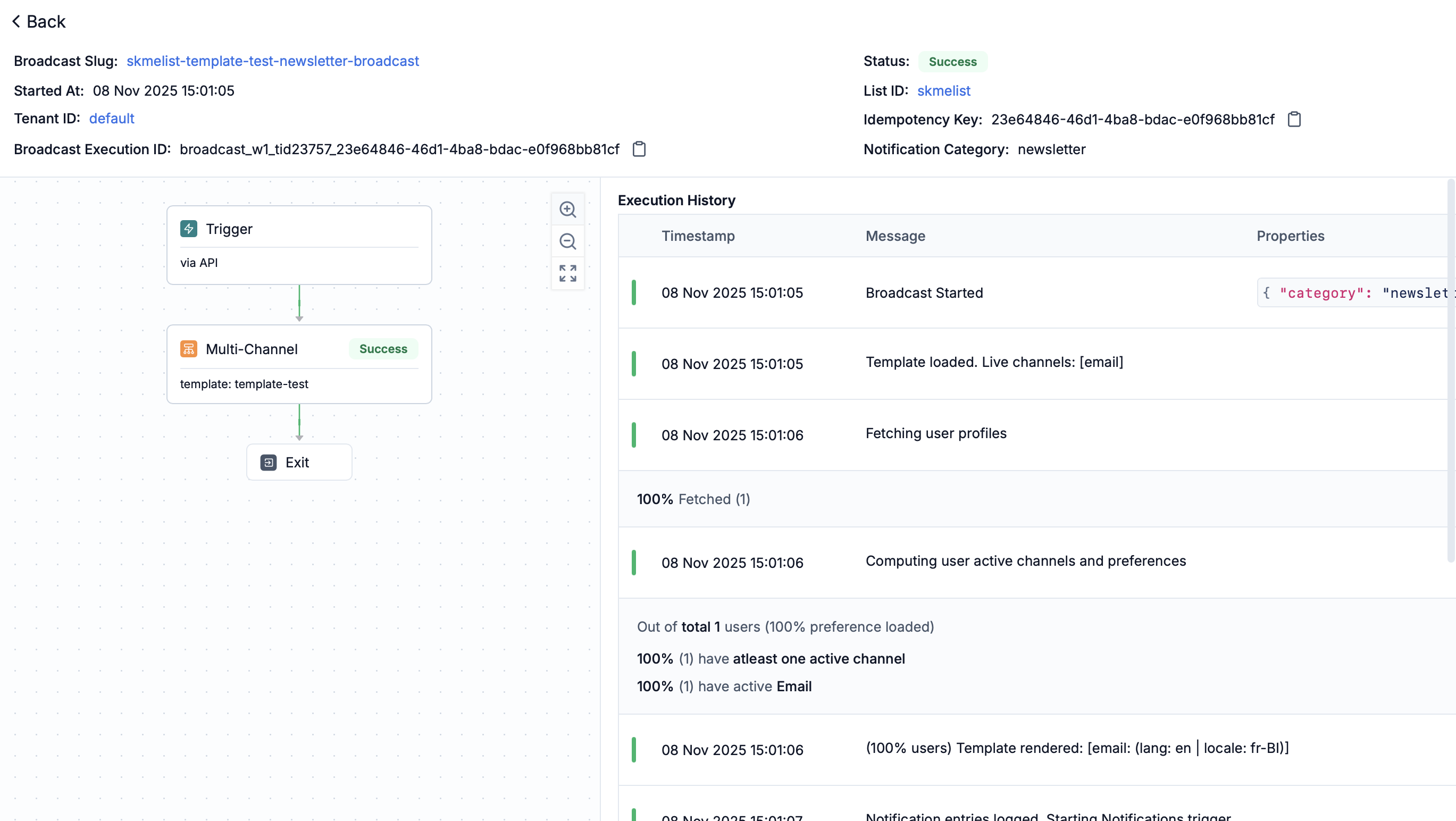 - Execution history: Chronological logs of broadcast start, template loading, user profile fetching (with progress percentage), channel computation, template rendering, and notification triggering.