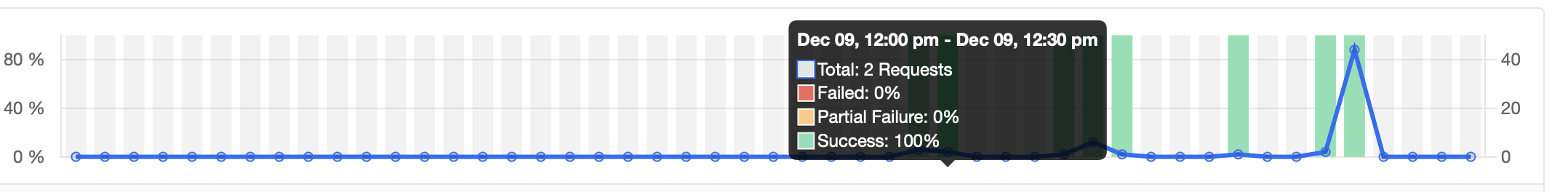 The request logs page displays an interactive graph showing request volume over time. Hover over any point to see date/time range, total requests, and success/failed/partial failure percentages. Click or drag to zoom into specific time periods.