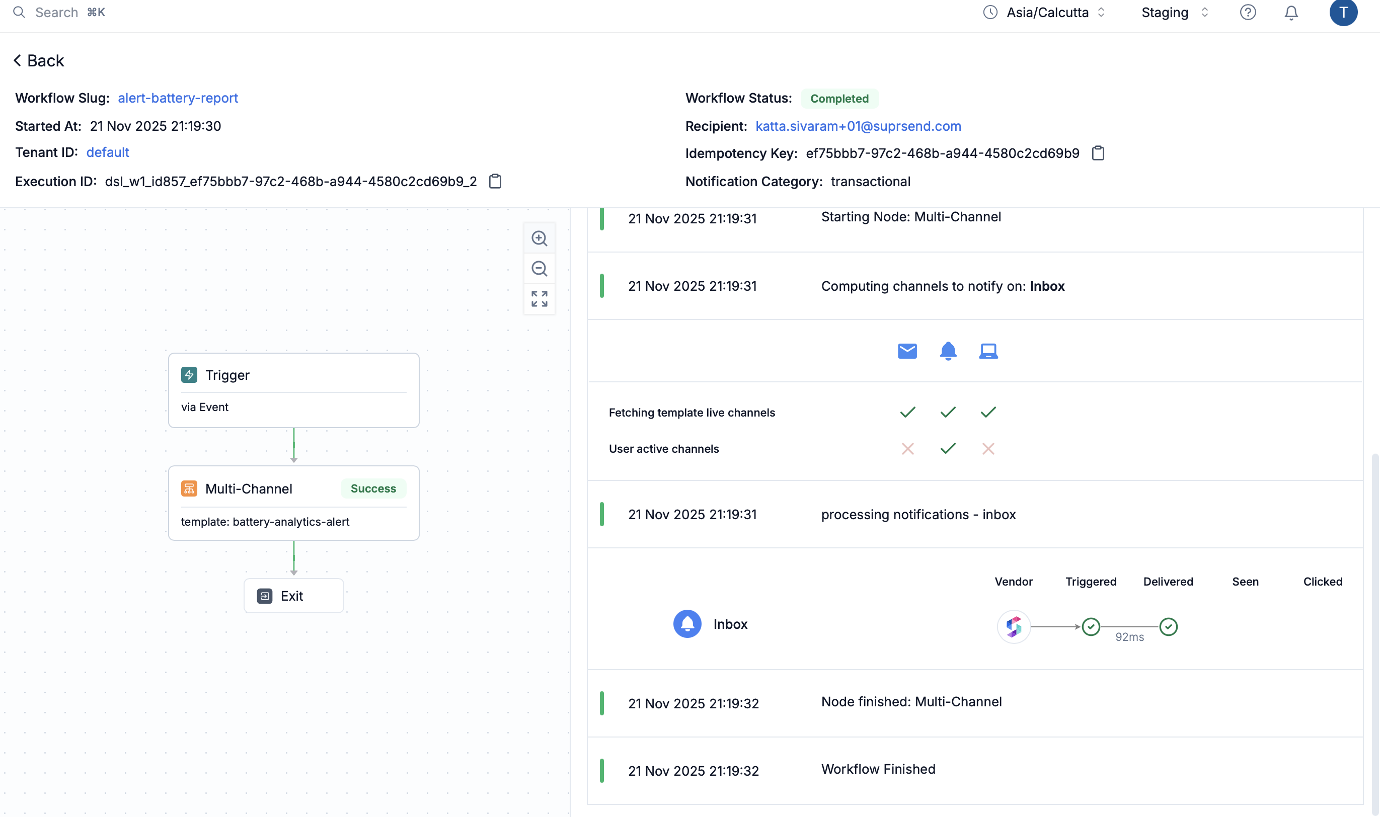 - Execution history: Chronological logs of workflow start, node execution, channel computation, template rendering, and notification triggers.