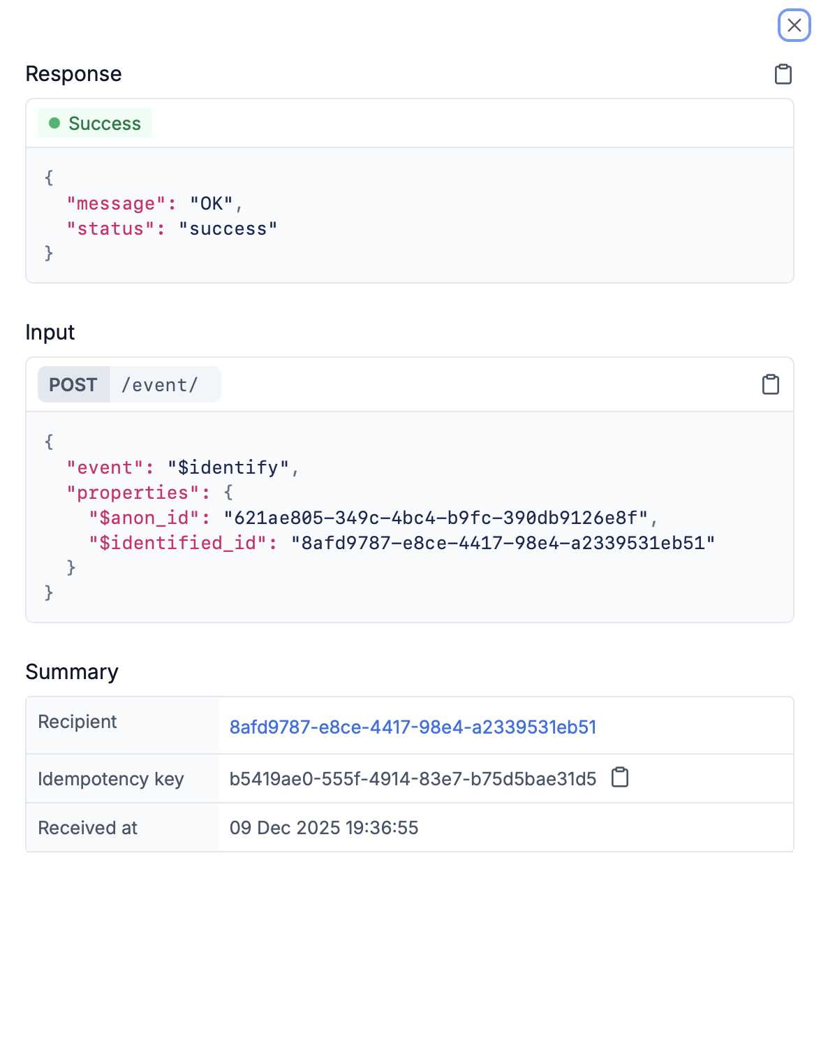 | Summary | Other relevant information like Recipient (clickable link to user page), idempotency key (with copy button), received at timestamp, workflow name , and tenant ID (if applicable) |