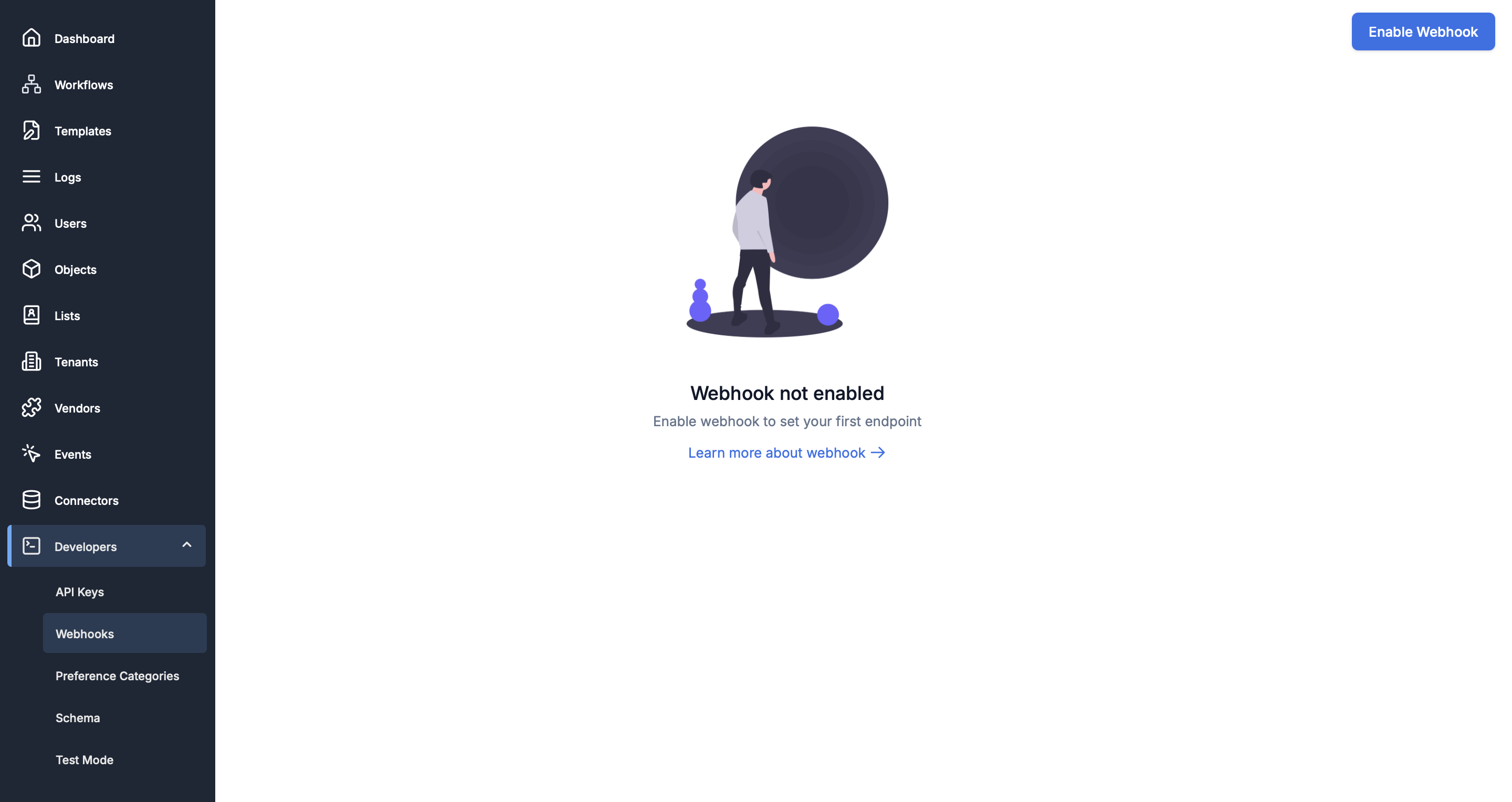 Navigate to the Developers section on SuprSend dashboard and go to Webhooks. On the webhooks page, click on “Enable Webhook”