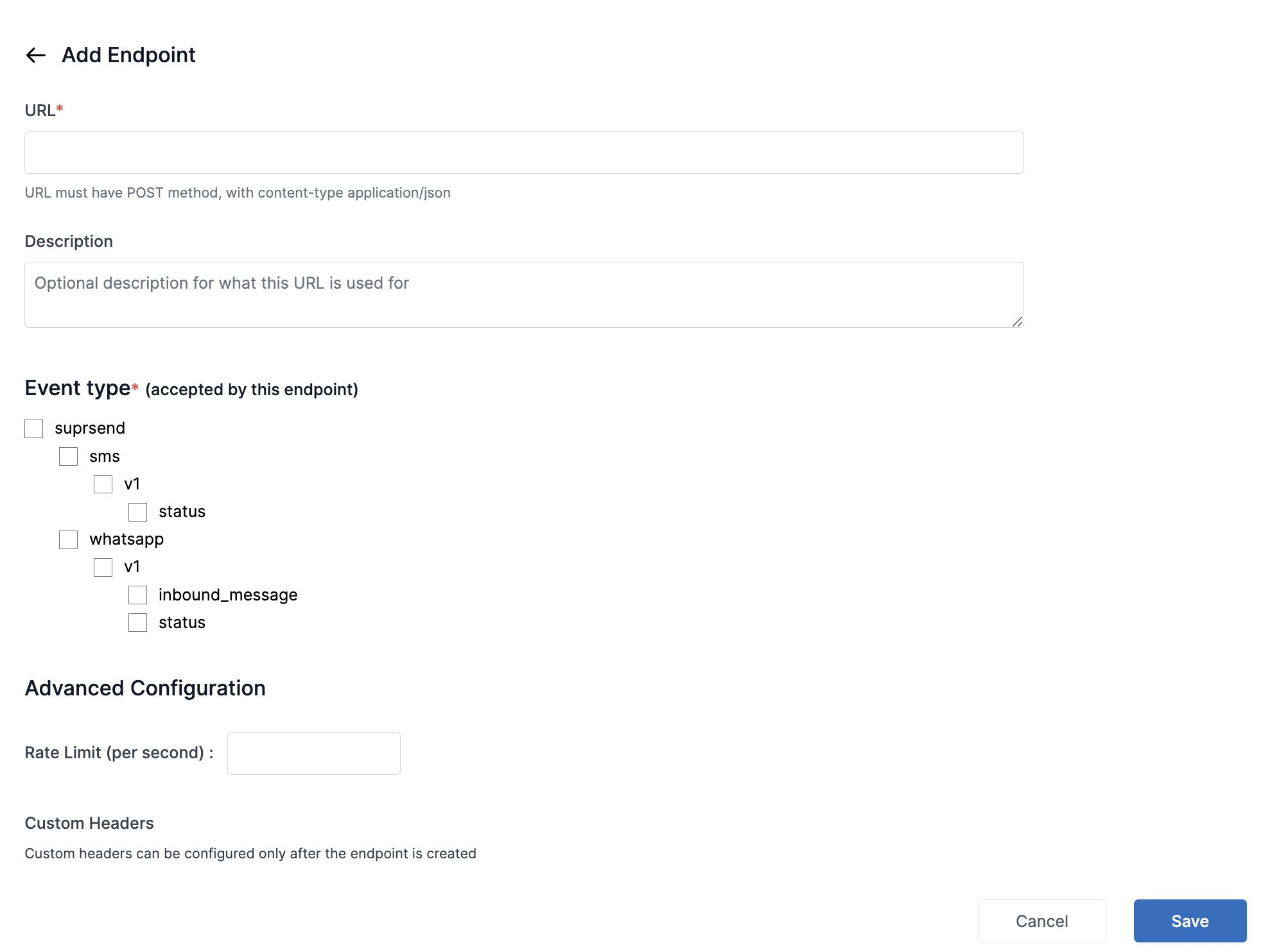 | Advanced Configuration -> Custom Headers | optional | You’ll be able to add custom headers after saving the webhook endpoint. Content-type = application/json is set by default. You can use this field to set authentication token in SuprSend request |