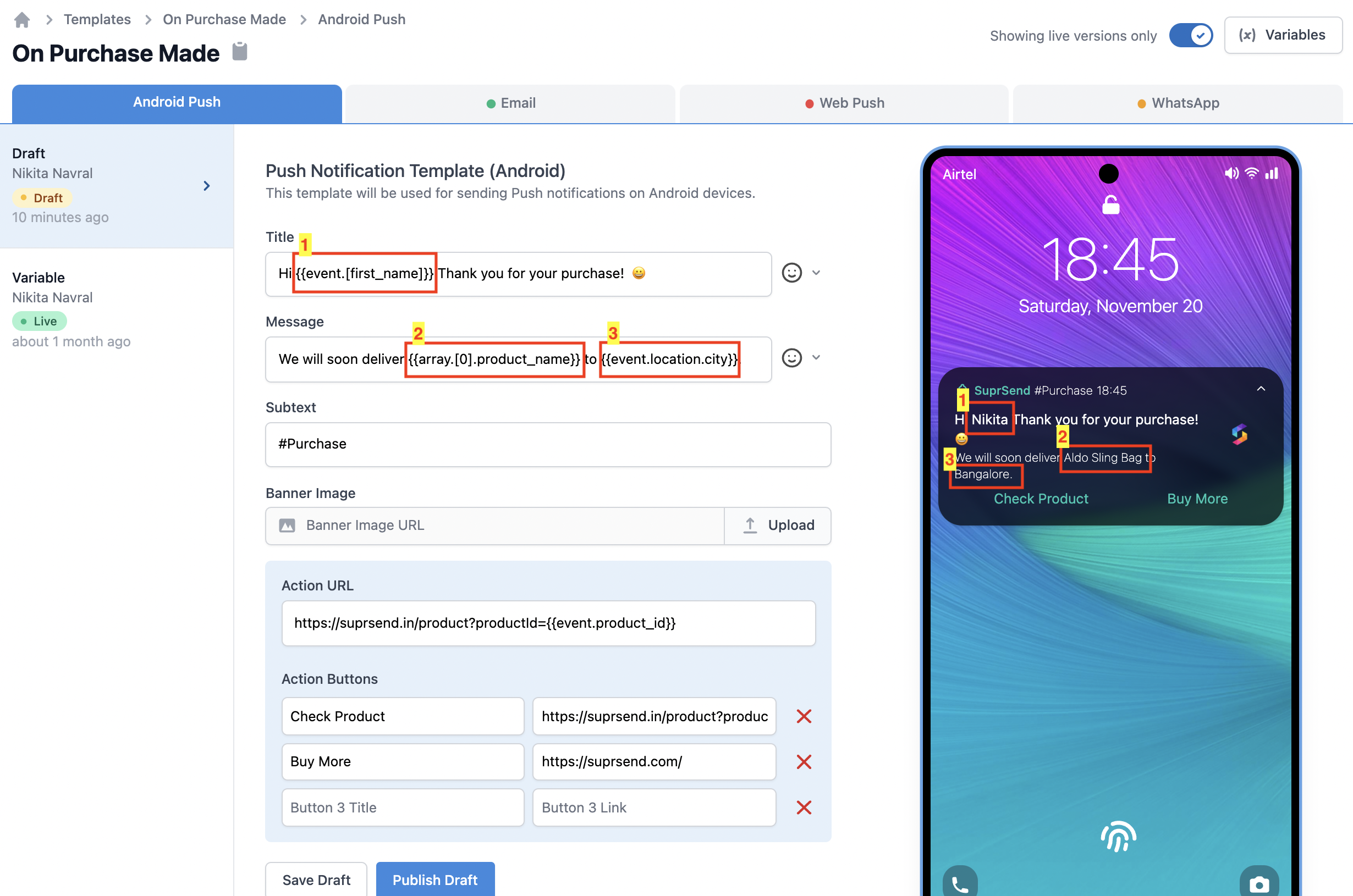 You can design template with a simple form editor tool. You can add variables withHandlebars language. You can check how the message will look in the preview section on the right side. Once designed, you can save the push notification template by clicking on Save Draft.