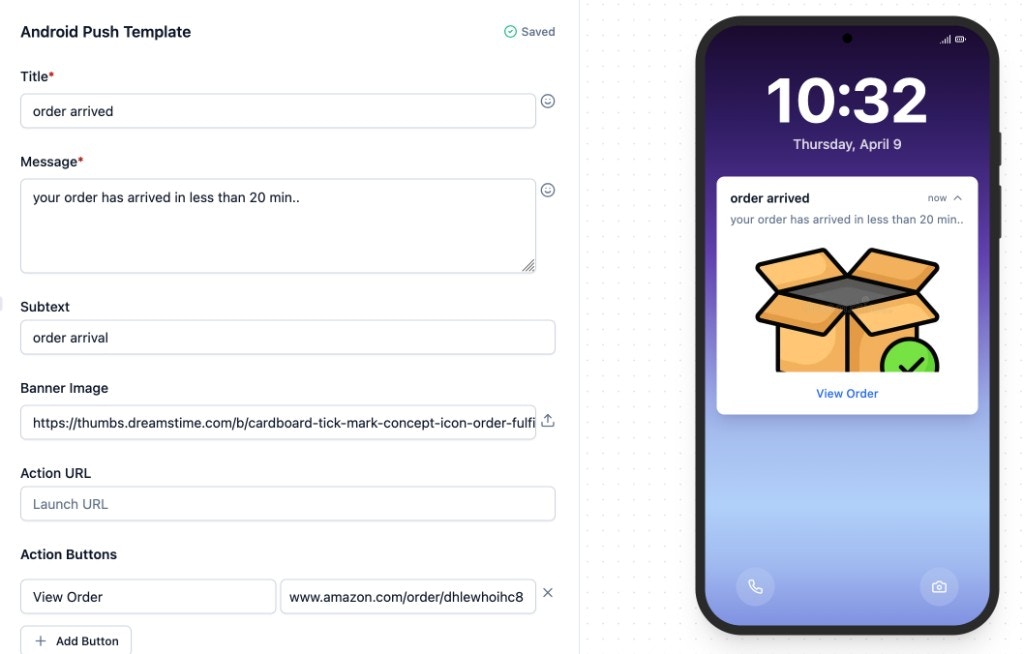 Title — single-line heading. Keep under 40 characters — Android truncates to one line. Supports Handlebars variables. Small Icon — icon in the status bar and notification header. Defaults to the SuprSend bell icon. See custom icon setup to use your app icon. Large Icon — appears left of the text on Android 4.0–6.0, right on Android 7.0+. Defaults to your organisation logo (set in Organisation Settings). Message — multi-line body text. Front-load key info in the first 2 lines (expanded view shows ~6 lines). Supports Handlebars variables. Subtext — optional. Appears next to your brand name at the top of the notification. Banner Image — optional. Supported formats: PNG, JPG, JPEG. Recommended: 2:1 aspect ratio, under 700 KB. Static uploads are auto-scaled and optimised by SuprSend. Action URL — URL opened on notification tap. Supports deep links and Handlebars variables. Action Buttons — optional. Up to 3 buttons with label + URL. Use 1-2 buttons with concise labels (2-3 words): “Track Order”, “View Details”. Supports Handlebars in both fields. Button colour is set in Organisation Settings.Adding dynamic content in Android Push