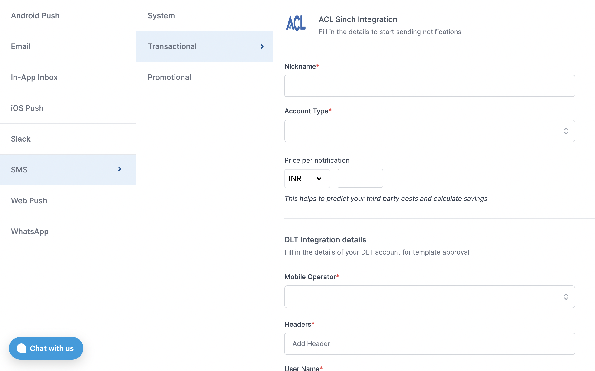 Password | Password for ACL account login. SuprSend uses this info to send SMS on your behalf via your registered ACL account. |