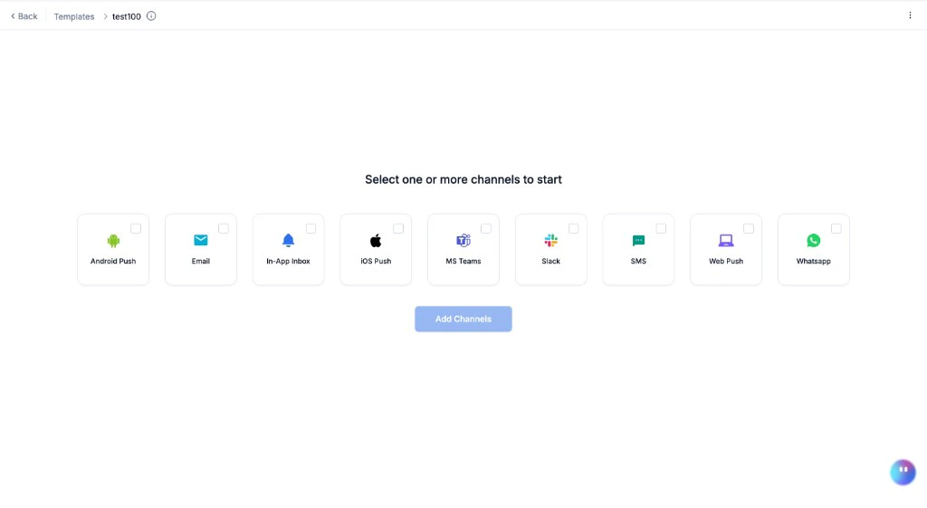 Select the channels you want to send on — for example, Email and SMS. You can always add more channels later by clicking the + tab in the editor.