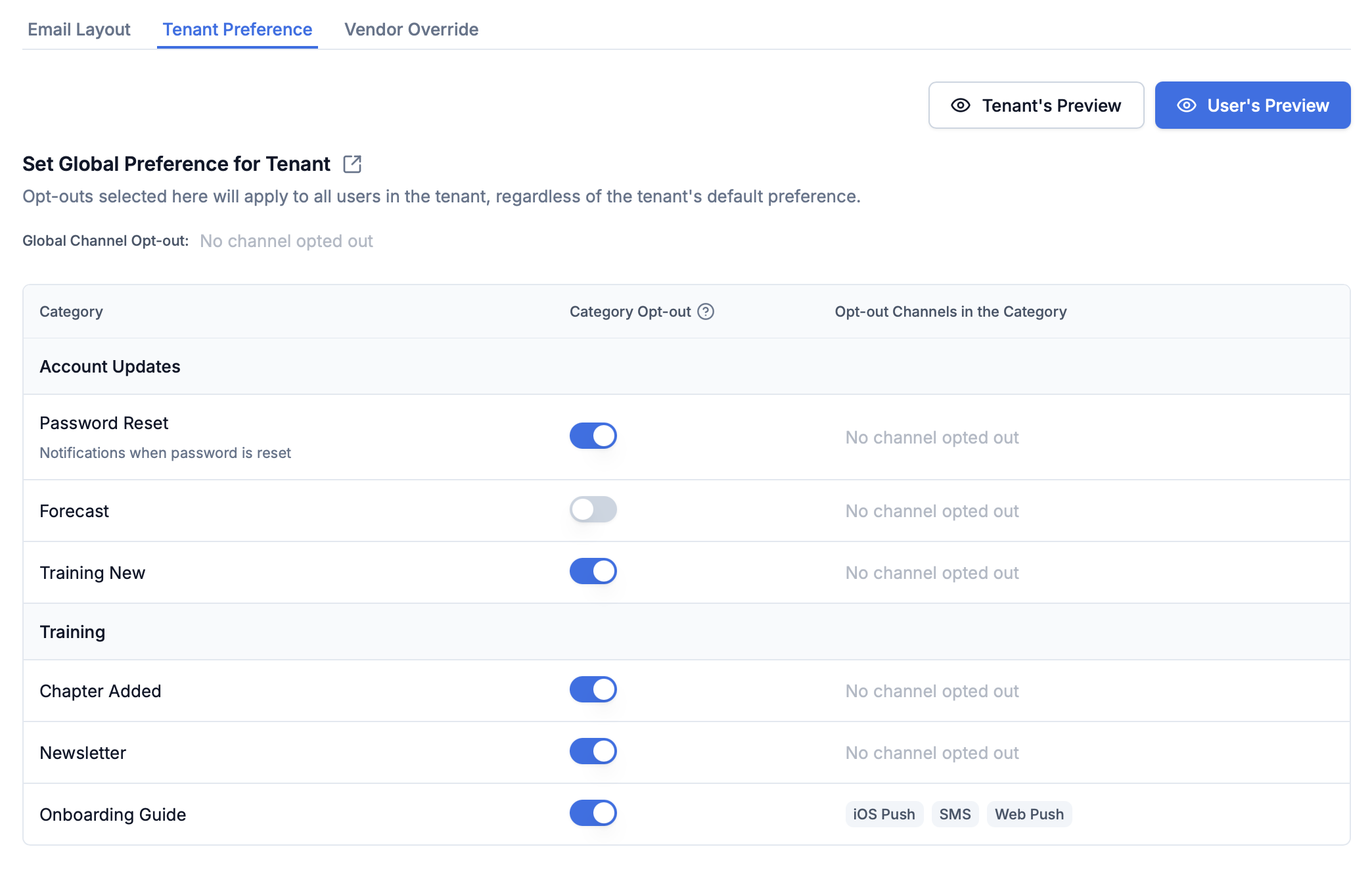 Tenant administrators can set default preferences for their end users and hide categories that aren’t applicable to their users. This gives tenant admins control over which notifications are sent to their users and which categories appear on their users’ preference pages. Tenant admins can override category defaults and hide categories that don’t apply to their users. These overrides apply only to that tenant and don’t change global category defaults. Common scenarios:- Hide entire sections (e.g., Sales section) from users’ preference pages