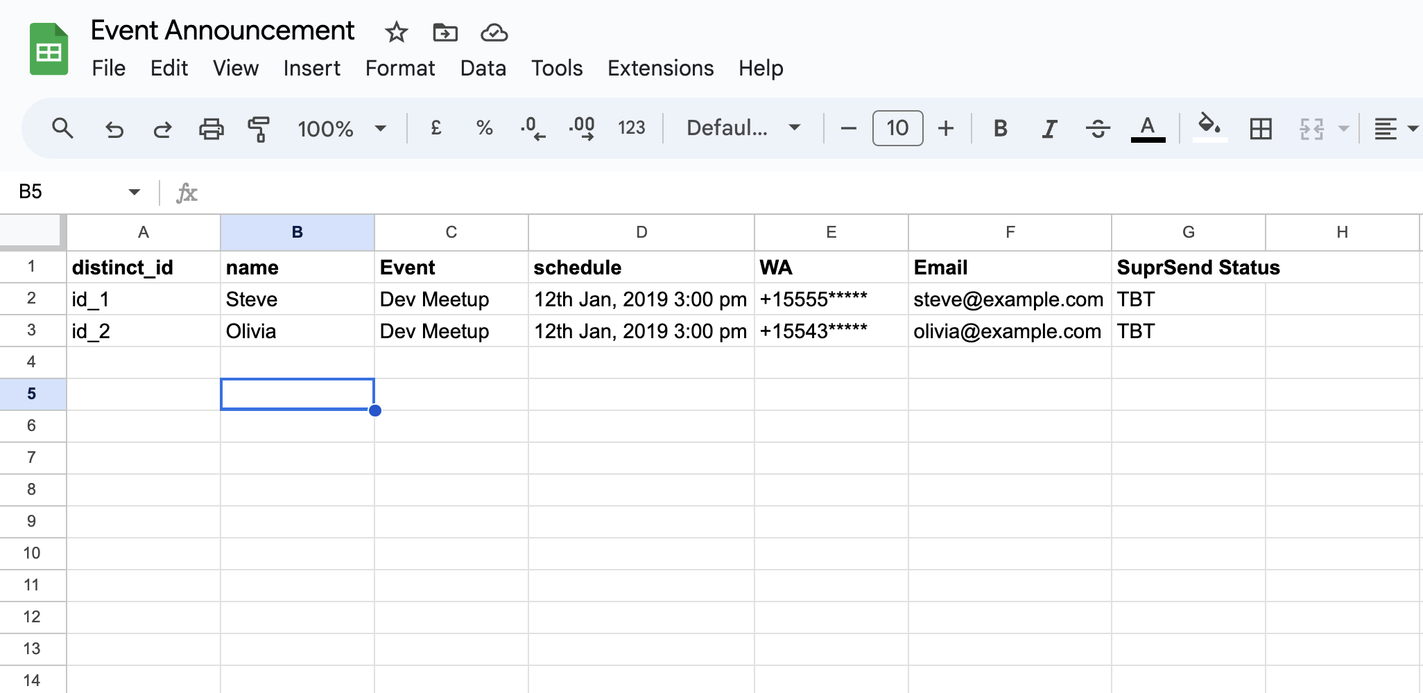 If this is the template content:Hi {{name}}, your {{Event}} is scheduled at {{Schedule}}. See you there., you’ll have to create a column for each template variable -name,Event, andschedulein your sheet. -