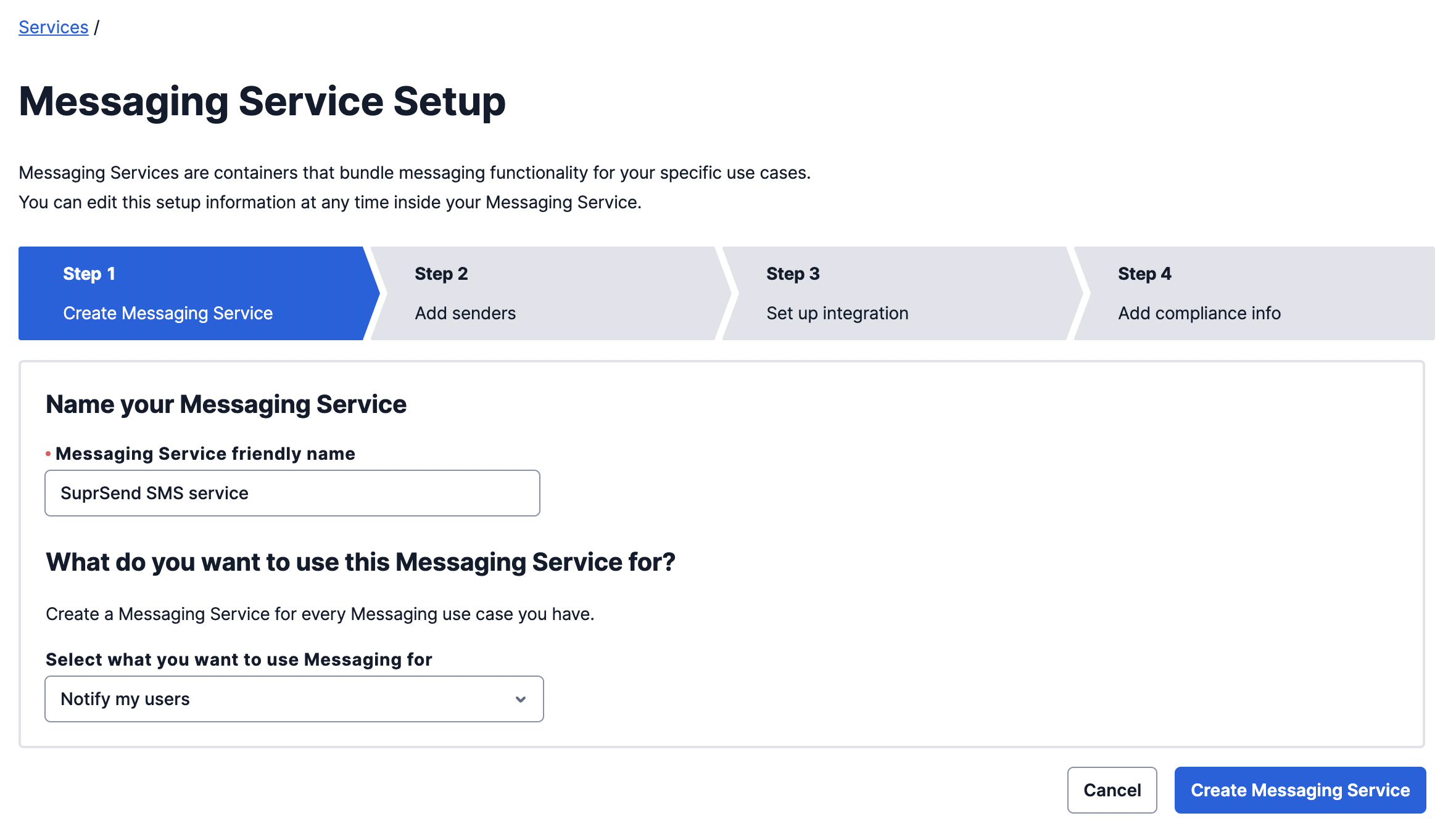 Use Caseoptions. For this tutorial, we can selectNotify my users. Next, clickCreate Messaging Service