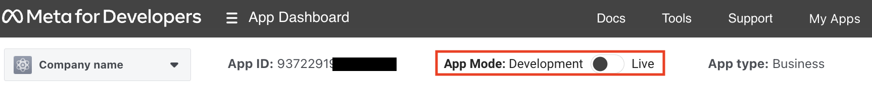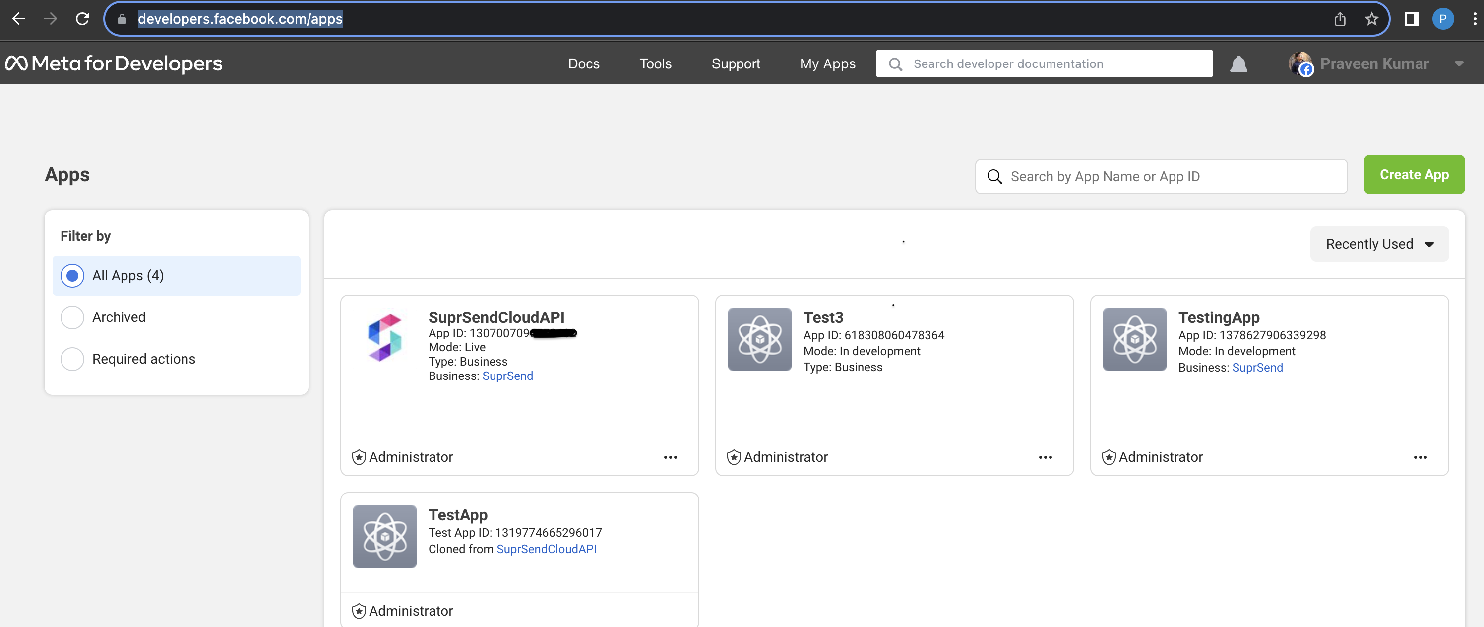 We will need App ID associated with your WhatsApp business account. You can either get it from the developers page as shown in screenshot above, to the left of App Mode.Alternatively, go to https://developers.facebook.com/apps, here you can see all the apps registered with your meta account. Copy the App ID from the App integrated with SuprSend.