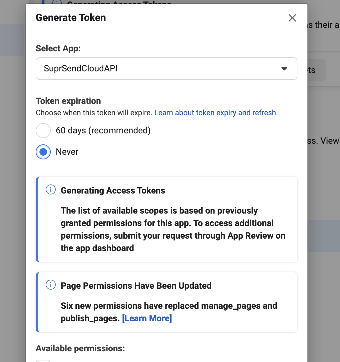 Go back to the system users page and select the recently created system user from the list. Then click the Generate new token button. Select your app, token expiry (never), and then on the bottom screen select permissions