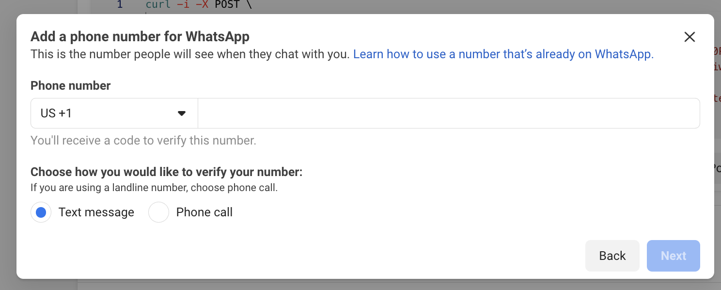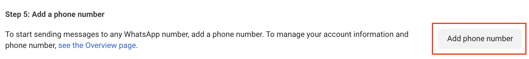 Scroll down to step 5 on the API page. To add your business phone number, Click on “Add phone number” and add your business information to register the number