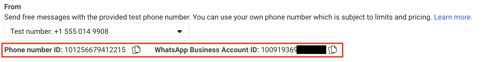 Phone number ID | mandatory | Phone number ID linked to your WhatsApp business number. You can get this from App dashboard (WhatsApp -> API Setup). Refer above step for more details. |