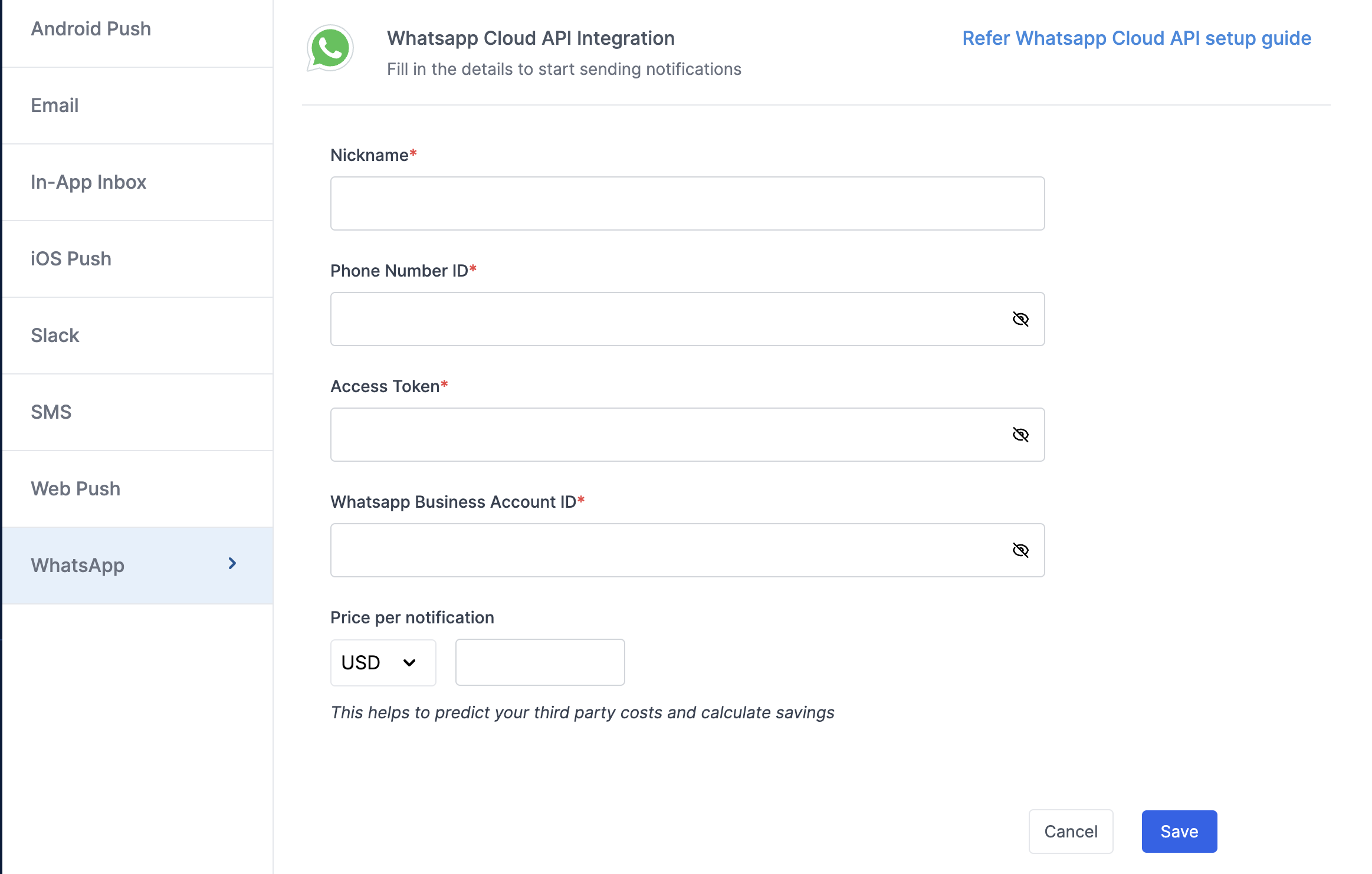 Price per notification | optional | This is the amount you pay per WhatsApp notification to Meta. It helps us to calculate, estimate and optimise your cost spent on notifications. |