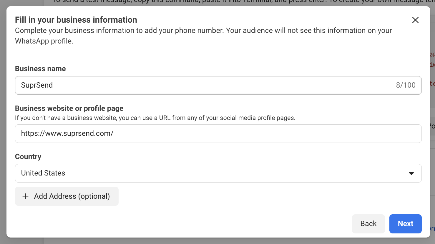 Add your business phone number. This will be the number from which your business communication will go through. If you are using an existing WhatsApp number, refer doc to migrate the business number.