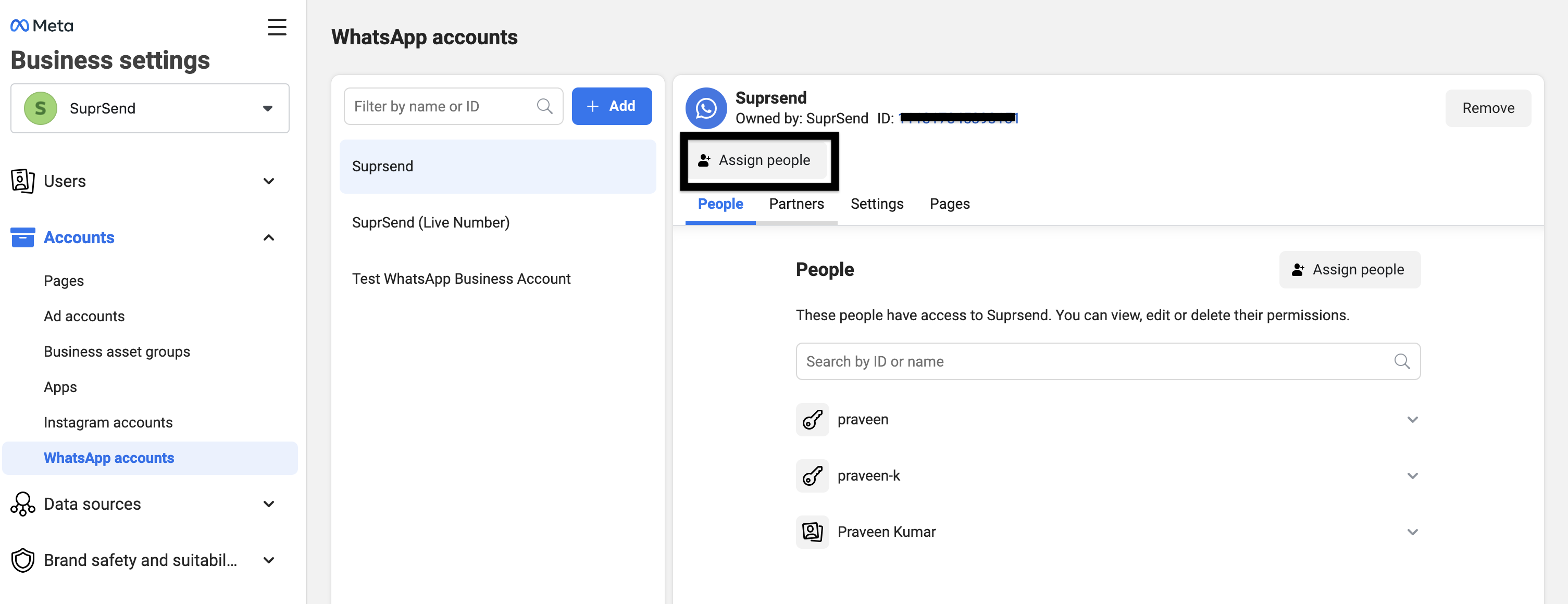 To do this from WhatsApp settings page go to WhatsApp accounts -> select your account. Now on the right panel there will be an option toAssign People, from there assign the System User that we created above to your account. After it’s assigned you’ll be able to see in People section as shown in the image below.