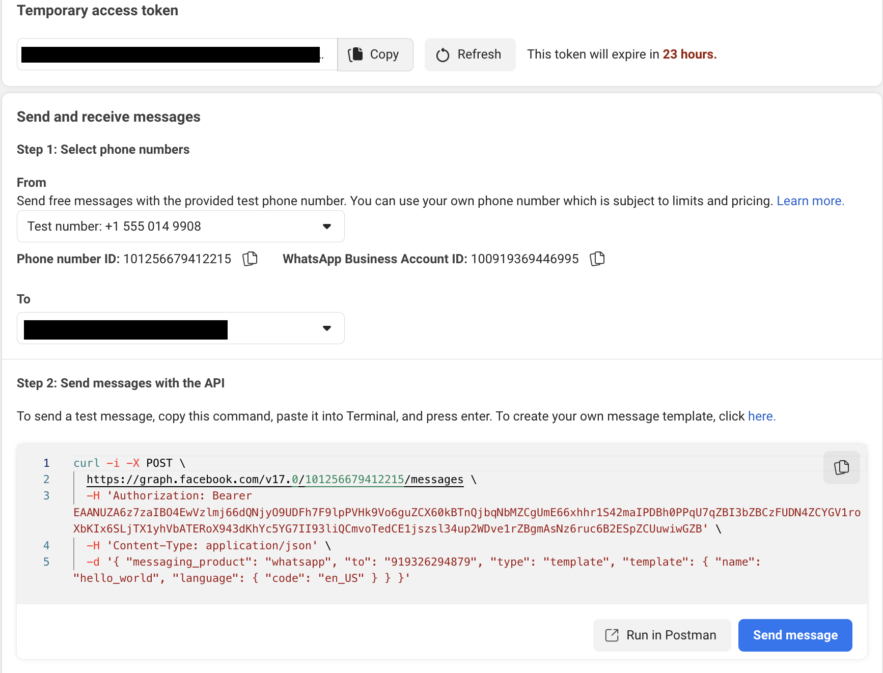 Access token | mandatory | Access token for authenticating the WhatsApp API request. You can generate a new access token by following the step above. |