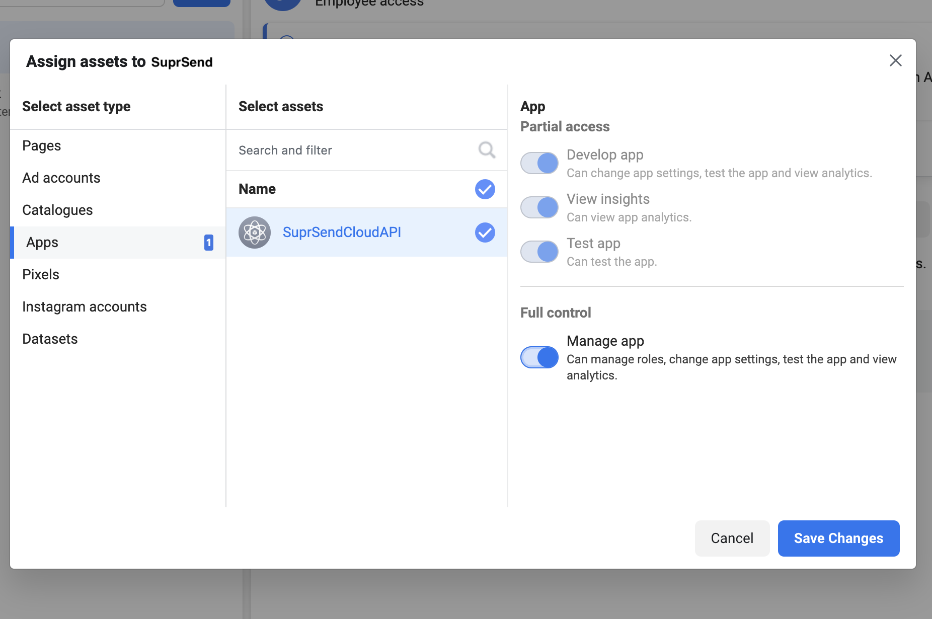 Select the user and Click on “Assign Assets.” Assign Full control to the new user. This will allow us to send messages on the behalf of this user through your WhatsApp cloud account.