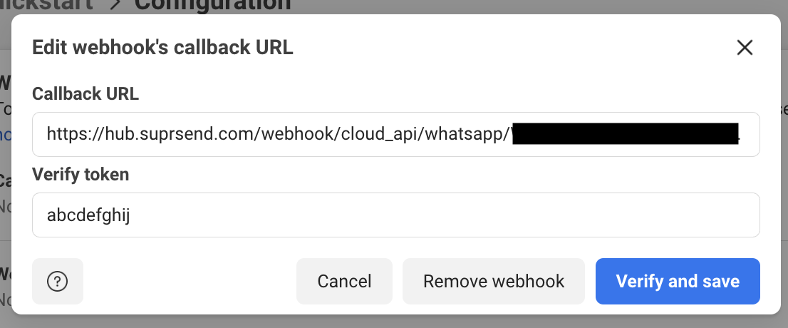 One of the platform advantage of using SuprSend as a central communication system is that it shows notification analytics for all channels in your SuprSend account together. To configure webhook URL, copy the URL from the vendor page and add it on your app dashboard (WhatsApp -> Configuration). Set verify token as572bcee9-4558-45ee-bbbb-fac5cb08766d