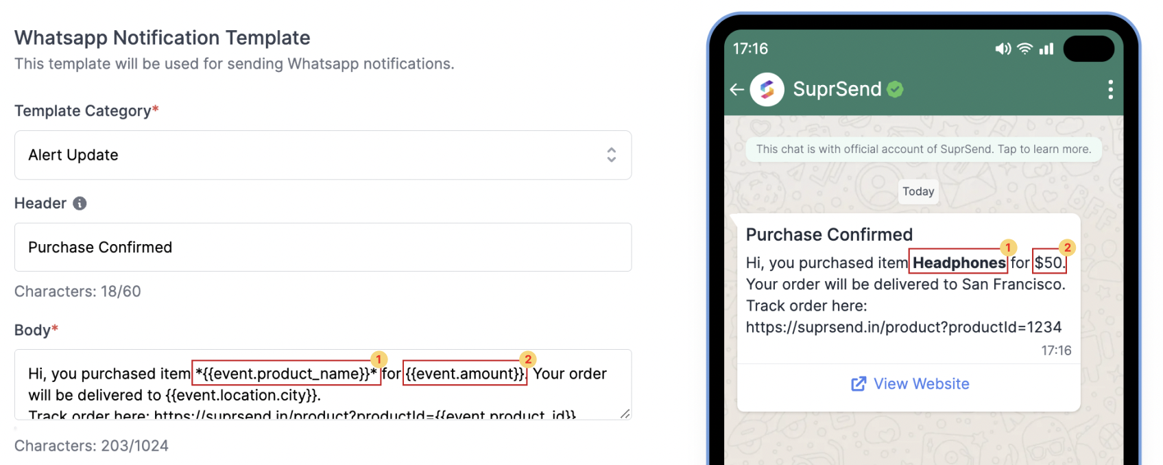SuprSend handles the WhatsApp approval process for you. All you have to do is create a template on SuprSend while following WhatsApp template guidelines, and we’ll send an email to you as soon as WhatsApp approves / rejects the template.